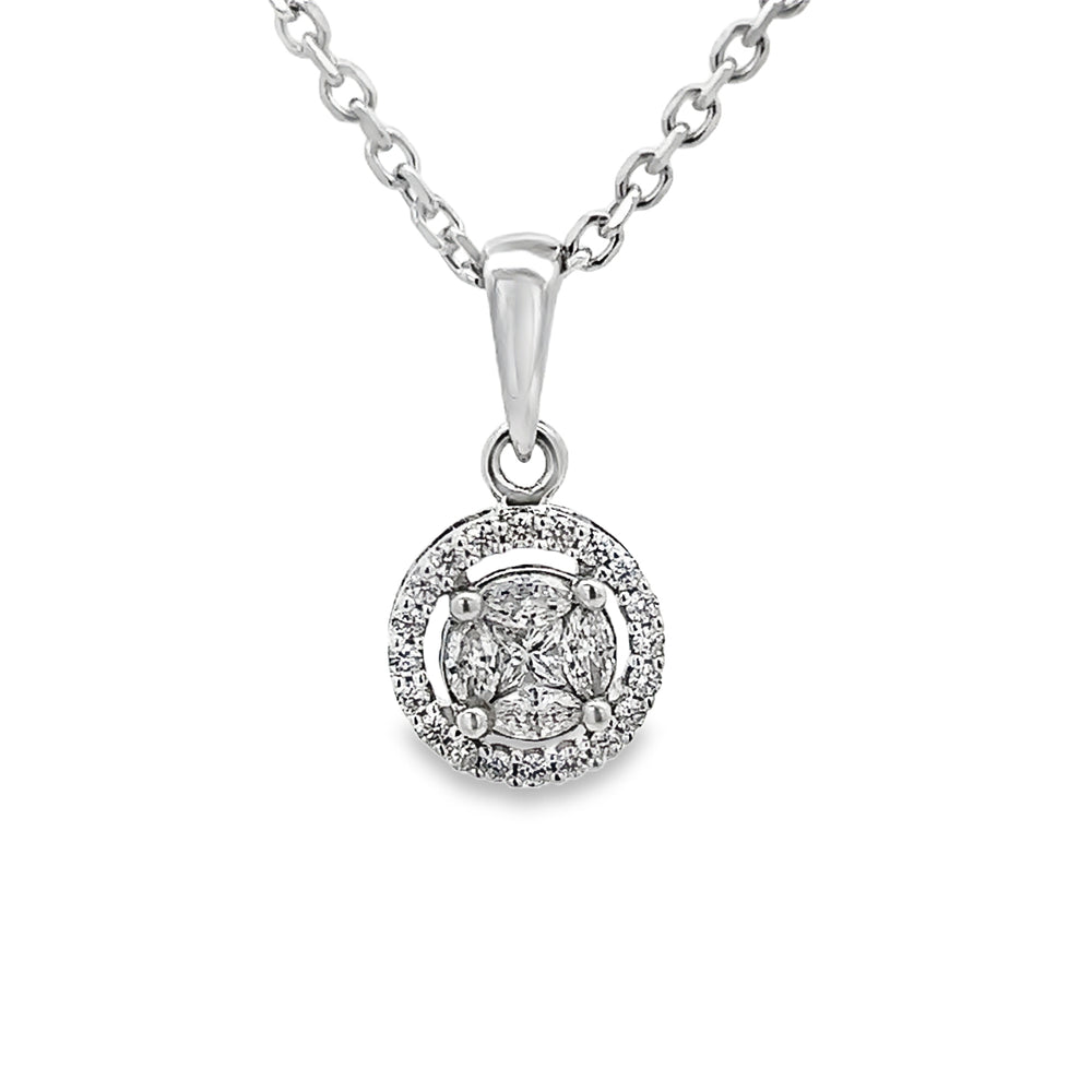 A Diamond Cluster Pendant in 14K White Gold that evokes modern elegance and quiet confidence. This pendant features 0.75 ctw of G–H color, SI2+ round diamonds for luminous presence and refined sophistication. View our Jewelry Collections